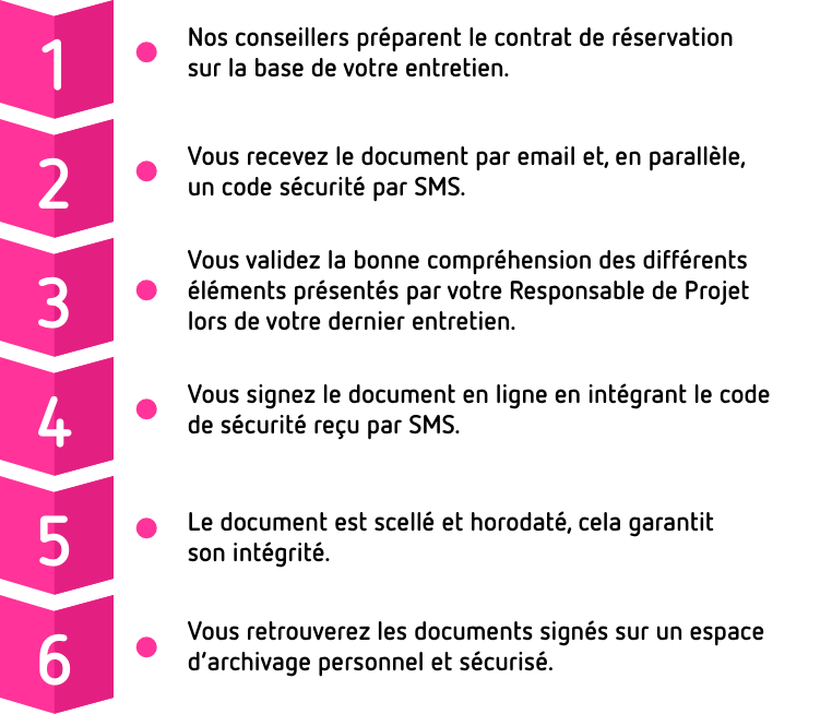 Elle vous permet de chez vous ou quel que soit le lieu, de signer votre contrat de réservation. Pour cela, l’accès à votre boîte mail ou à votre téléphone mobile (sms) suffit.
